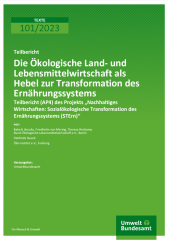 Jánszky, B.; Mering, F. v.; Renkamp, T.; Quack, D. (2023): Die Ökologische Land- und Lebensmittelwirtschaft als Hebel zur Transformation des Ernährungssystems. Teilbericht (AP4) des Projekts „Nachhaltiges Wirtschaften: Sozialökologische Transformation des Ernährungssystems (STErn)“; Umweltbundesamt, Dessau.